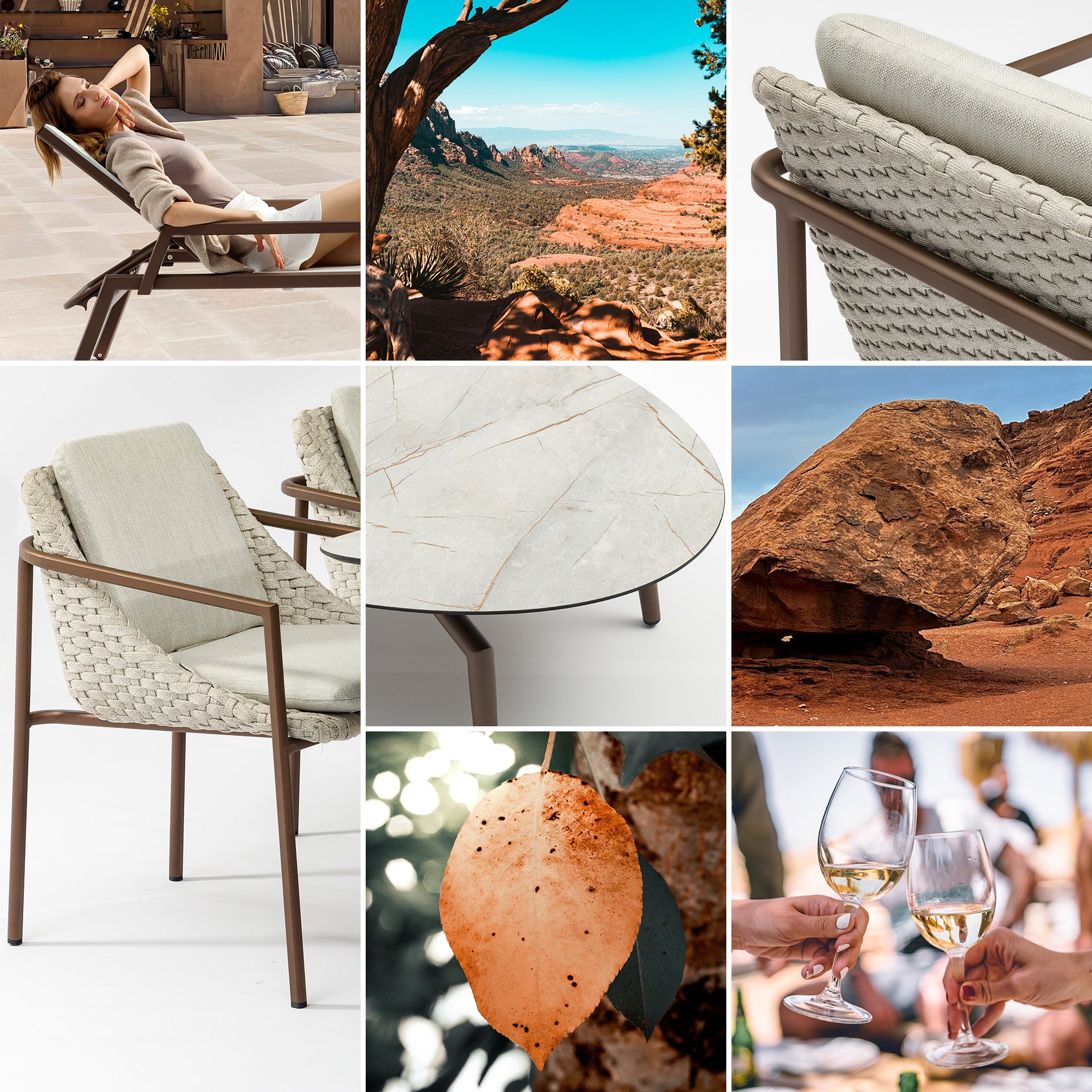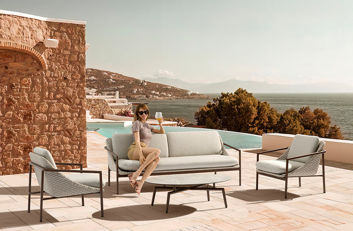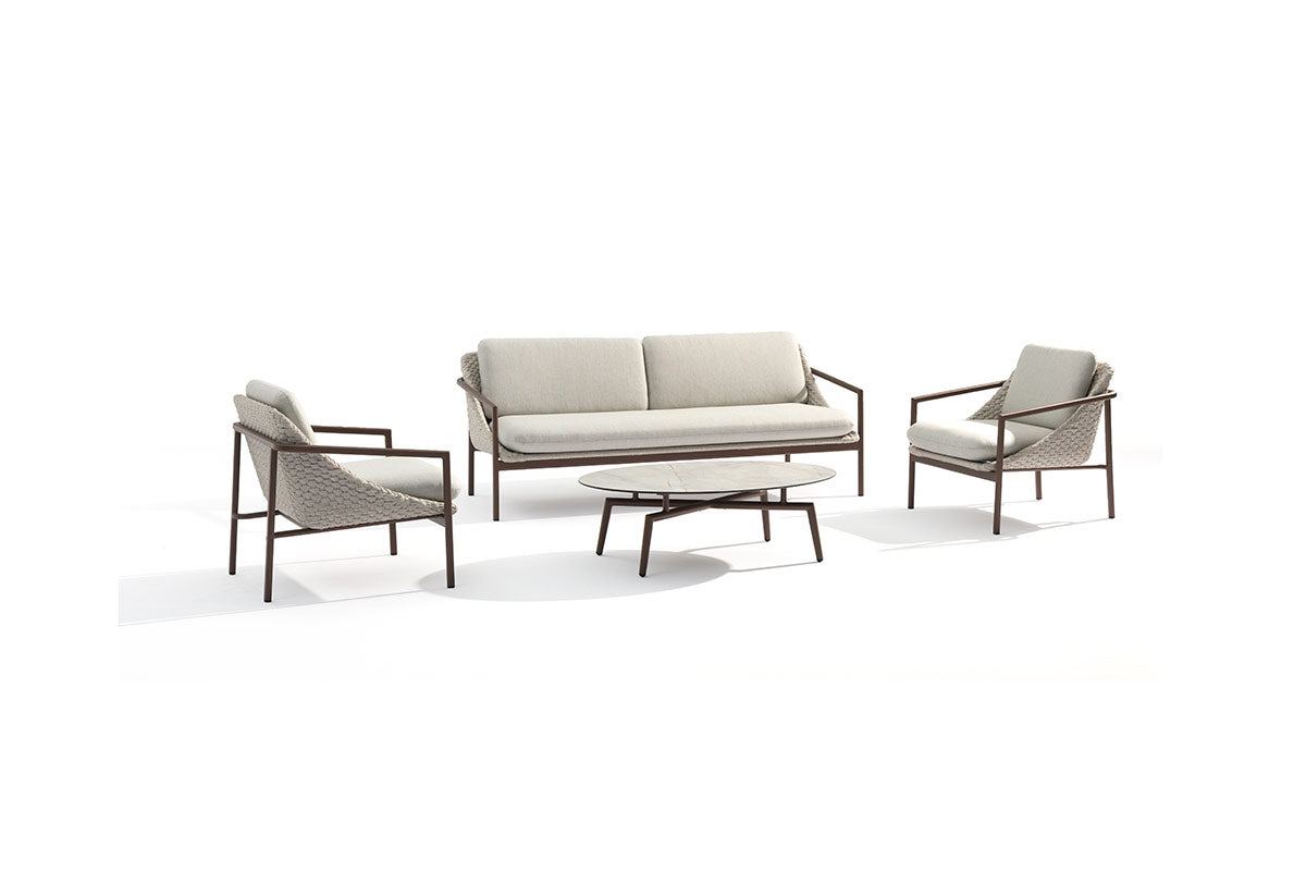 Start with an elegant structure in dark bronze, add a beautifully weaved shell and comfortable seats and backs dressed in a classy weather resistant fabric and there we go, we use it inside or outside?